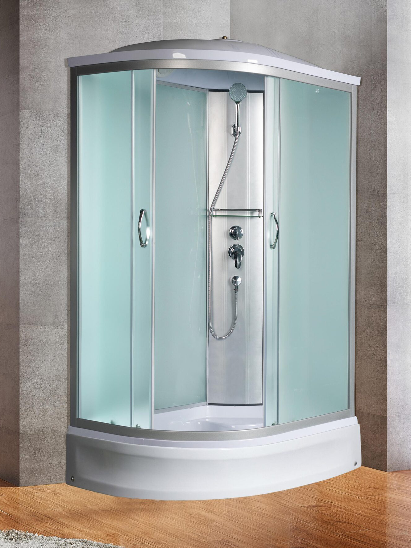 Душевая кабина River Nara 100х80 МТ R 10000003640 превосходно сочетается в интерьере любой стилистической направленности за счет изысканных форм и плавных линий. Полотно двери выполнено из закаленного стекла толщиной 4 мм. Кабина оснащена стеклянной полочкой и ручным душем