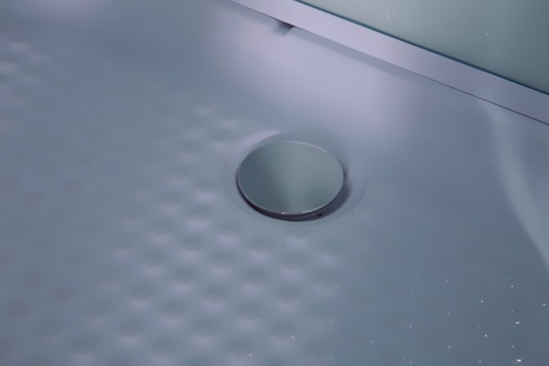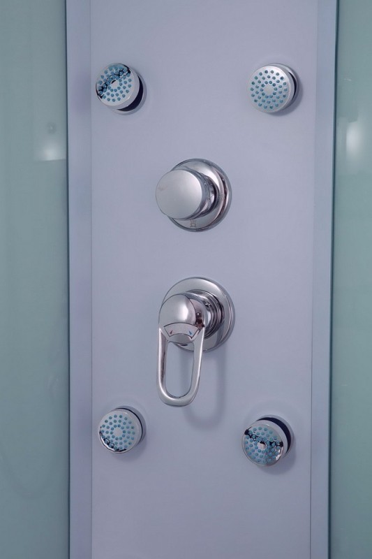 Душевая кабина с гидромассажем, невысоким акриловым поддоном, с раздвижными дверцами на саморегулирующихся роликах. Дверцы с металлическими ручками.