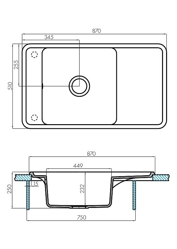 - Размер мойки (ШхВхГ): 870x250x510 мм.
