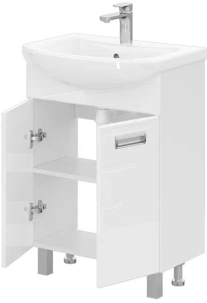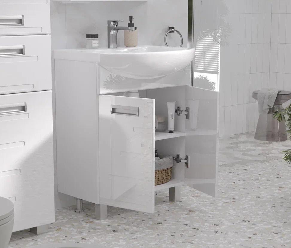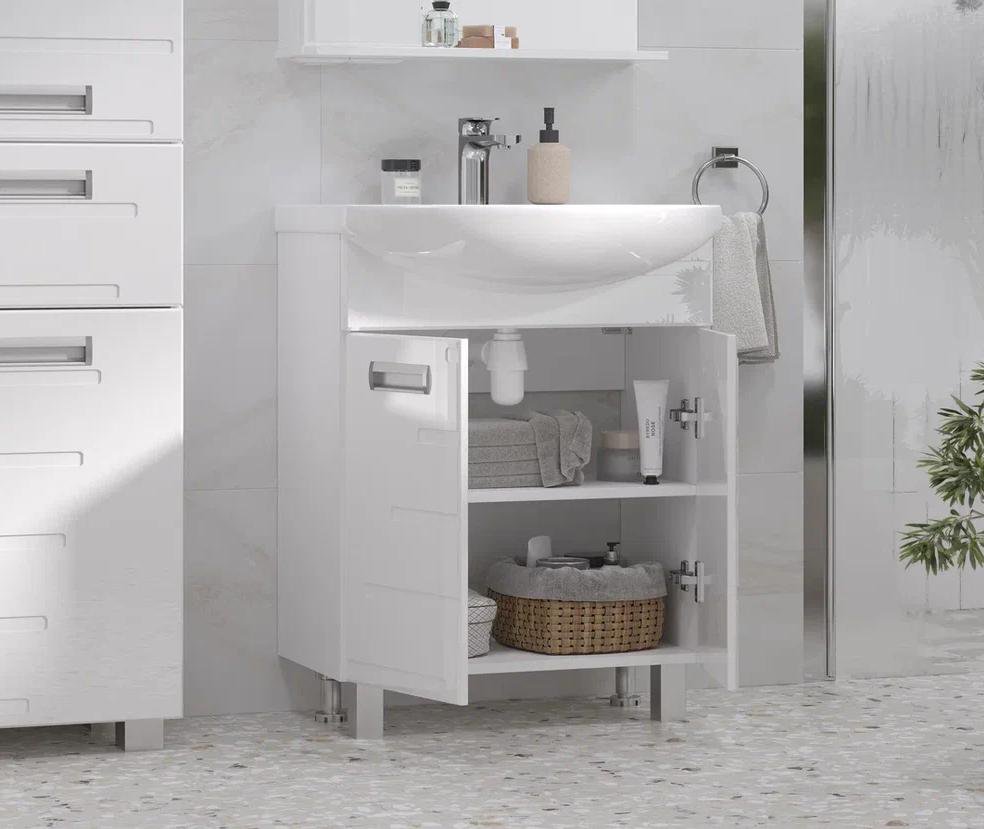 Тумба отличается компактными размерами, что делает ее идеальным выбором для небольших ванных комнат. Распашные дверцы обеспечивают удобный доступ к внутреннему пространству, где можно хранить различные предметы личной гигиены.