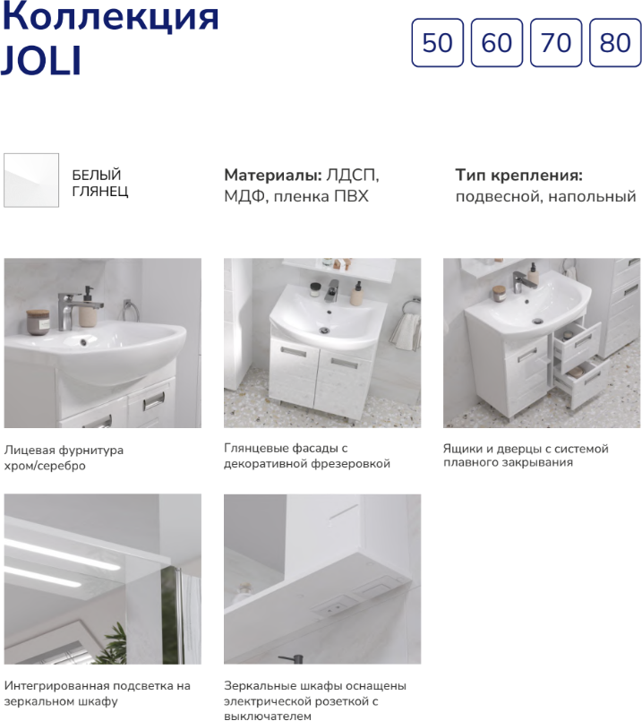Эта модель также оснащена высококачественной фурнитурой и изготовлена из надежных материалов. Фасад изготовлен из влагостойкого МДФ, облицованного глянцевой пленкой ПВХ, а петли оснащены доводчиками для плавного закрывания дверцы. Тумба также устанавливается на четыре регулируемые опоры и фиксируется к стене при помощи специальных креплений.