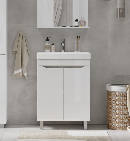 Дверцы тумбы изготовлены из МДФ и облицованы глянцевой пленкой ПВХ, что придает им прочность и устойчивость к влаге. Интегрированные ручки обеспечивают удобное открывание, а система плавного закрывания делает использование тумбы более безопасным и комфортным.