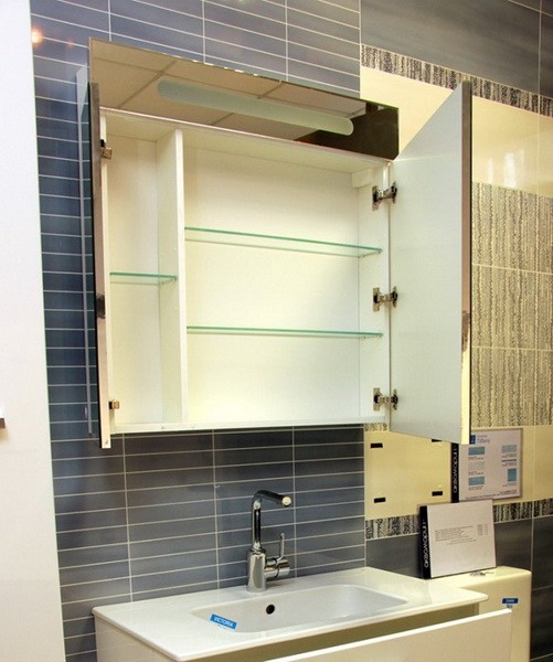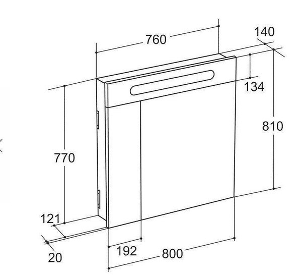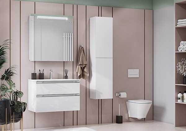 Снабжен механизмом мягкого закрывания двери, встроенным светильником, крепежом к стене. Левое открывание дверцы.