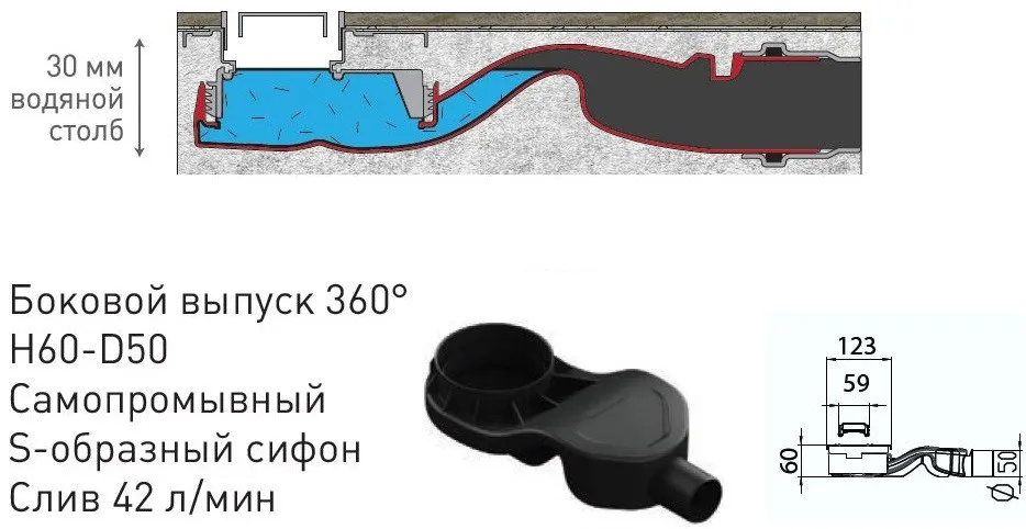 Самопромывной S-образный сифон PP: горизонтальный выпуск D50 H60, пропускная способность 42 л/мин, монтаж 360°